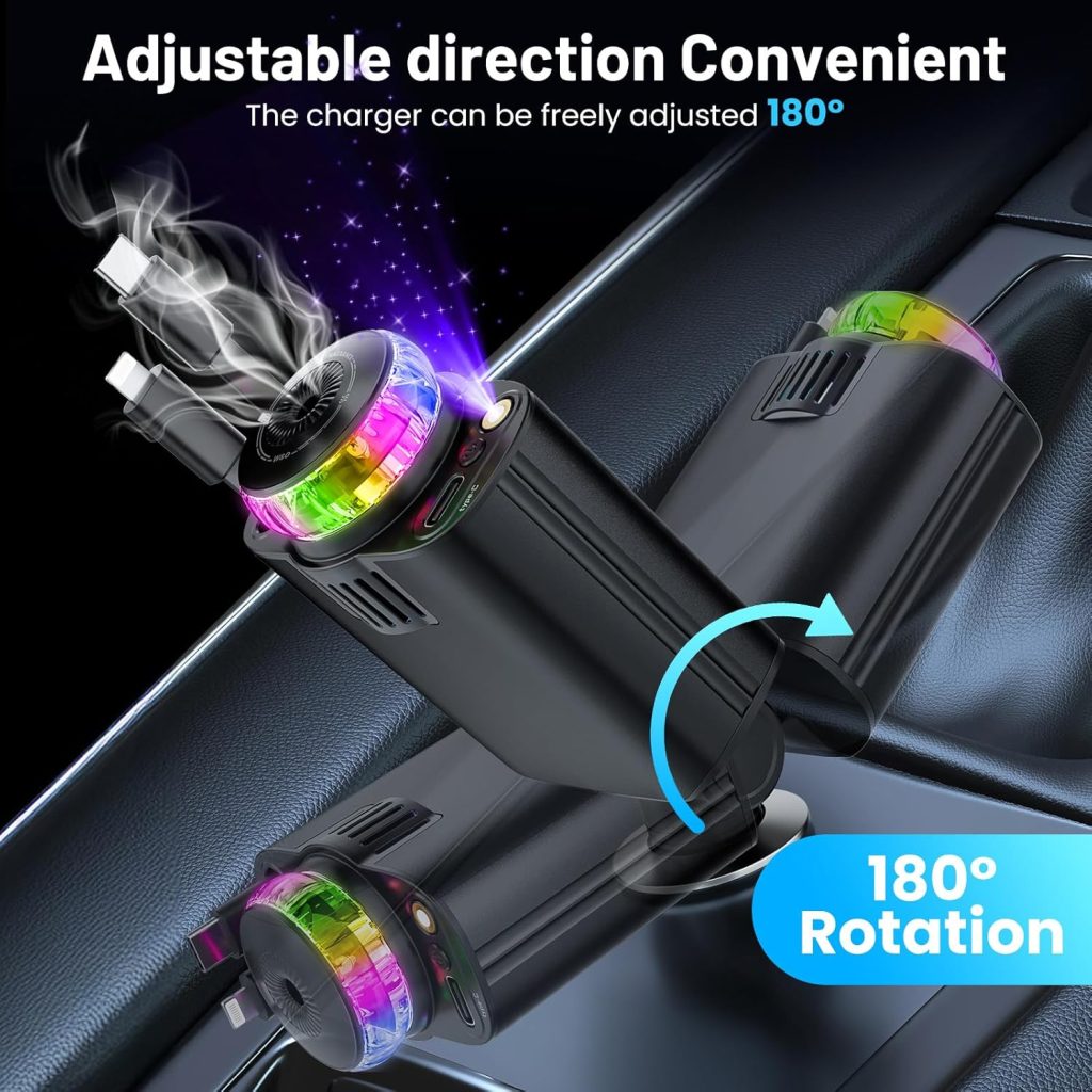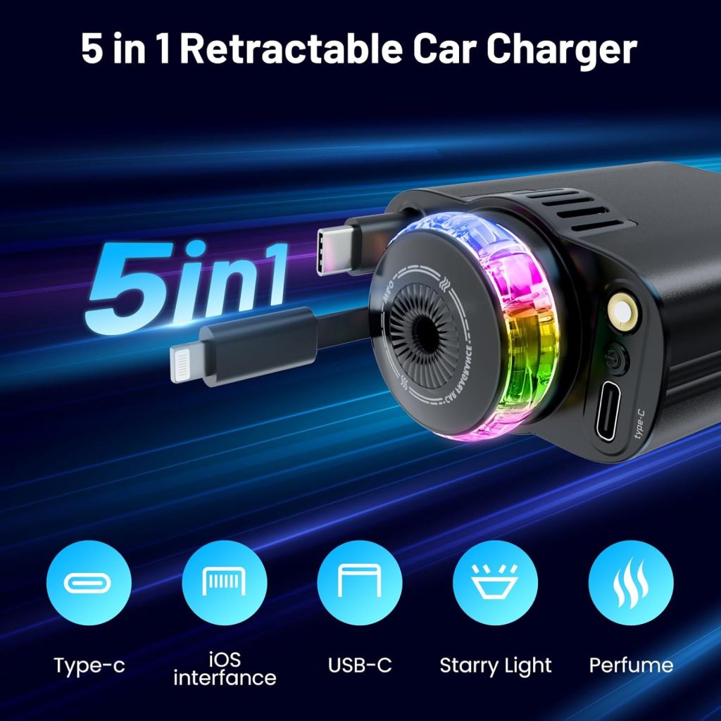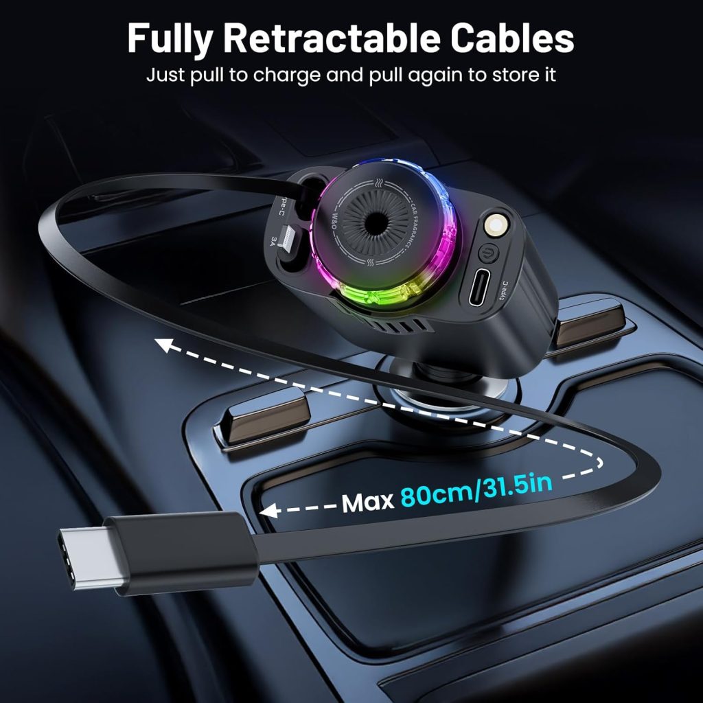 Most car chargers just charge your phone. This one does five incredible things at once. It features two retractable charging cables (Type-C and Lightning) that extend up to 31.5 inches and automatically retract with a simple push. No more messy cables hanging around your car. It also includes an additional USB-C port and USB-A port, so you can charge up to four devices simultaneously.